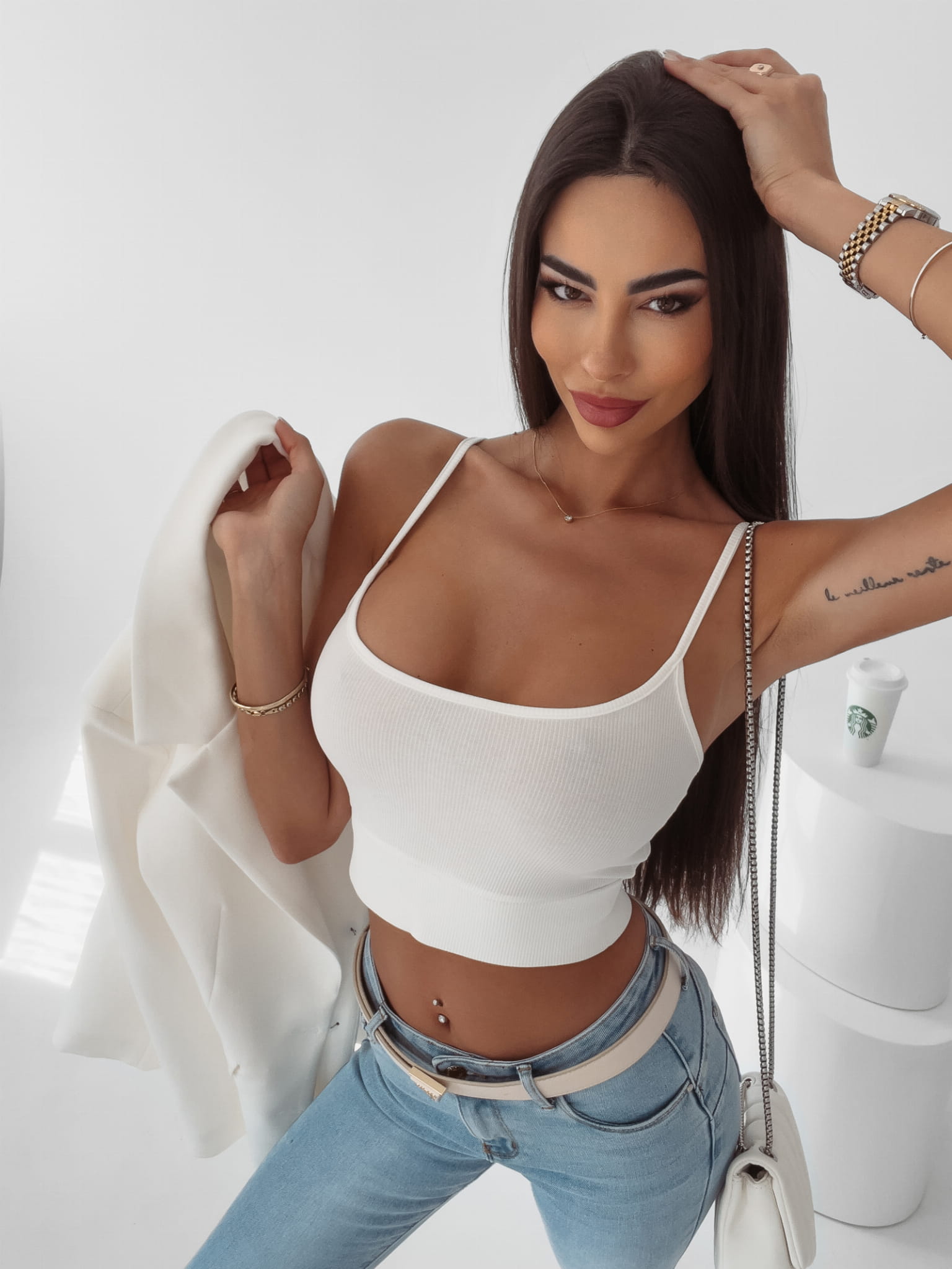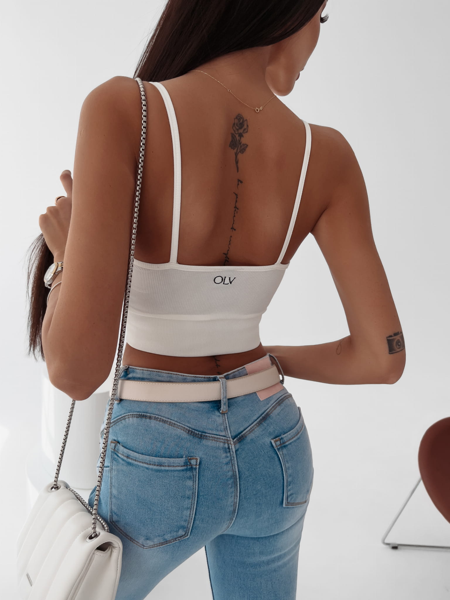 Krótki, dopasowany top na ramiączkach, zakończony na dole szeroką gumą, idealnie podtrzymującą biust. Na tyle delikatny haft OLV. Basic pod marynarkę, ramoneskę czy po prostu do noszenia w upalny dzień.