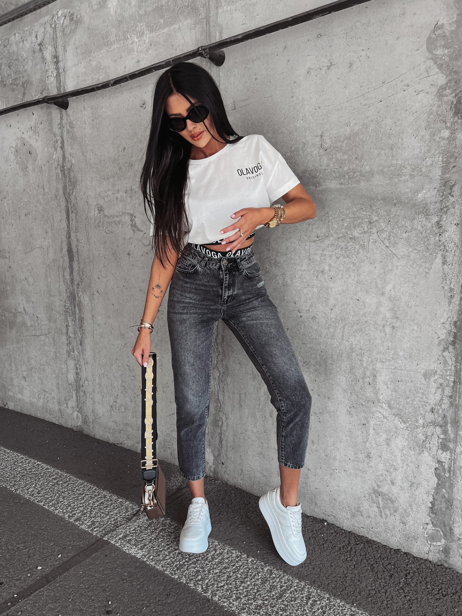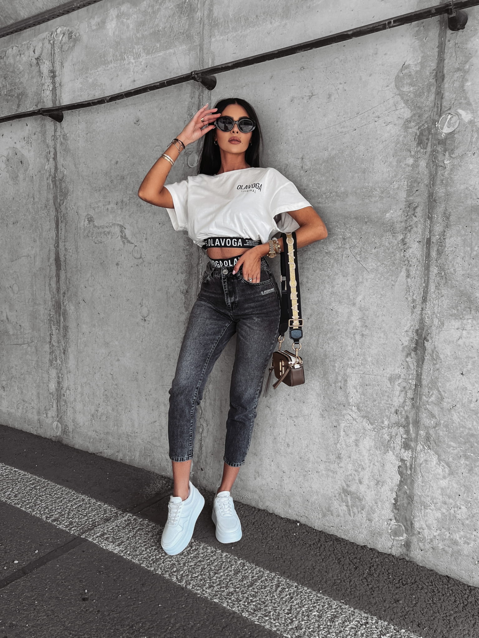 Luźny T-shirt o sportowym charakterze z haftem logo, i gumką w talii z napisem OlaVoga, oraz dużym pisemnym nadrukiem na plecach.