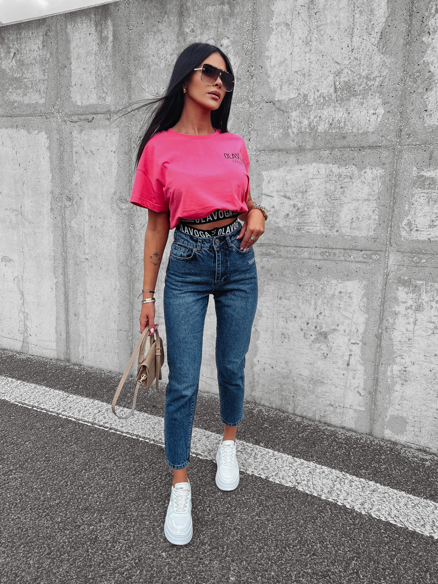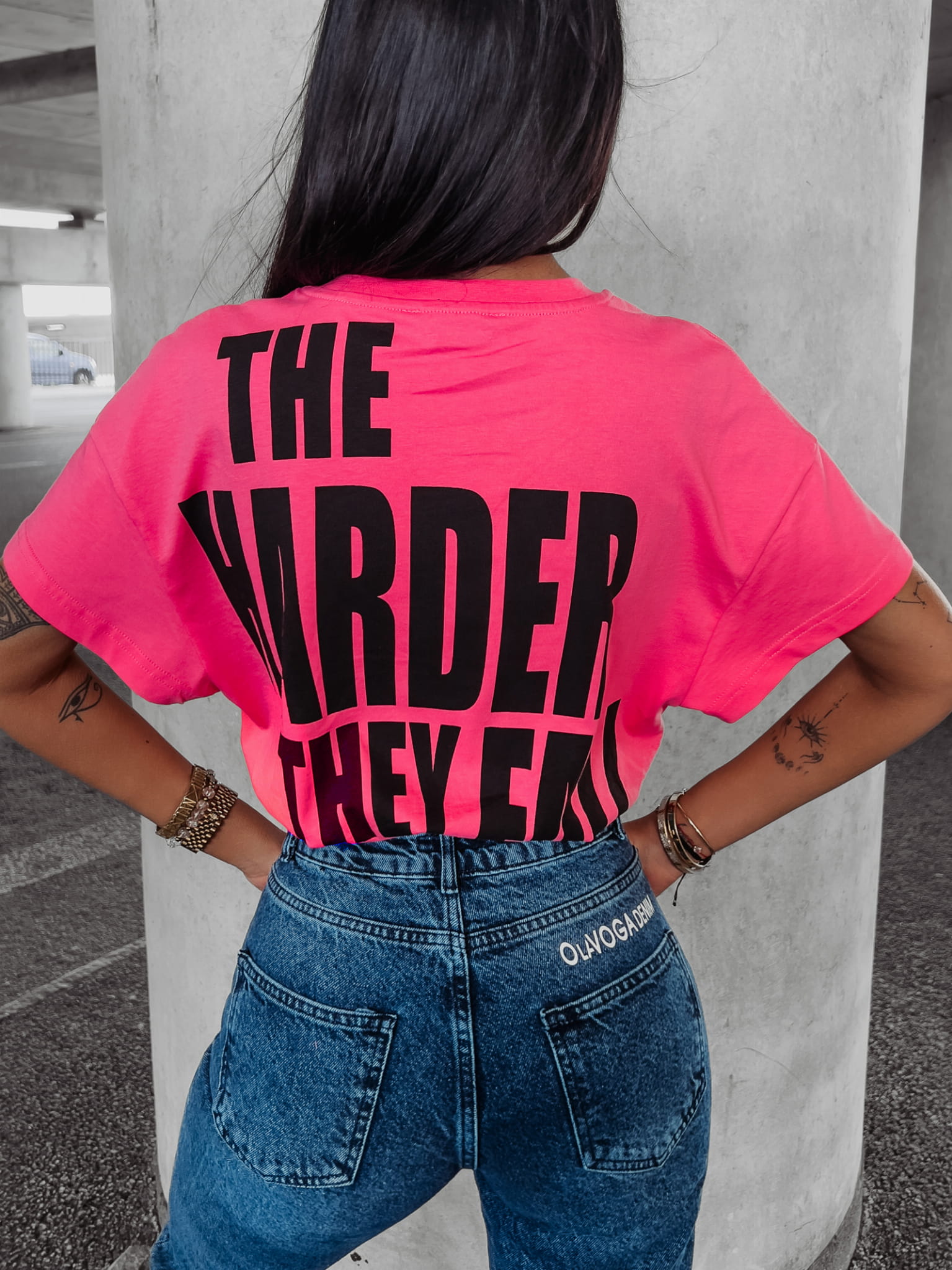 Luźny T-shirt o sportowym charakterze z haftem logo, i gumką w talii z napisem OlaVoga, oraz dużym pisemnym nadrukiem na plecach.
