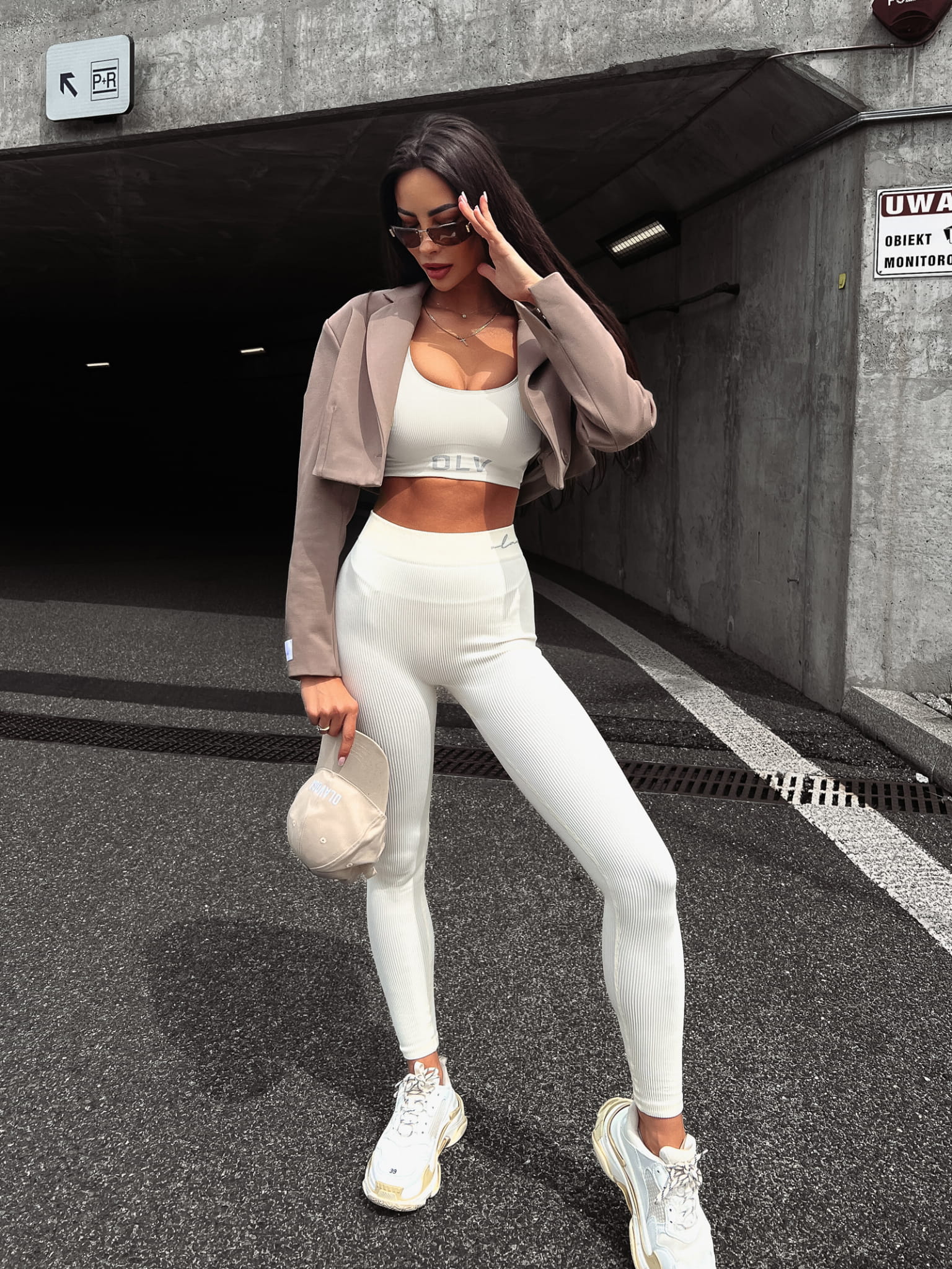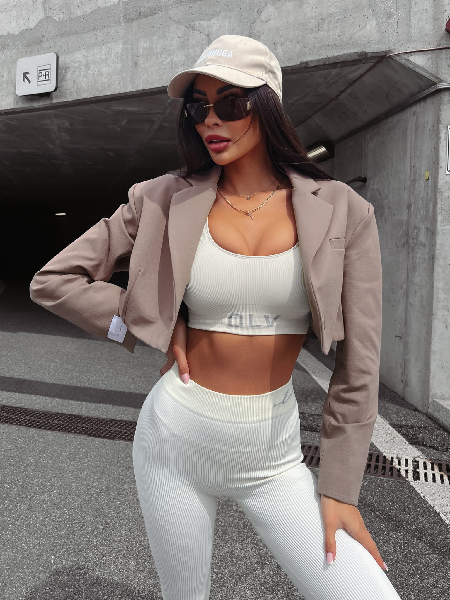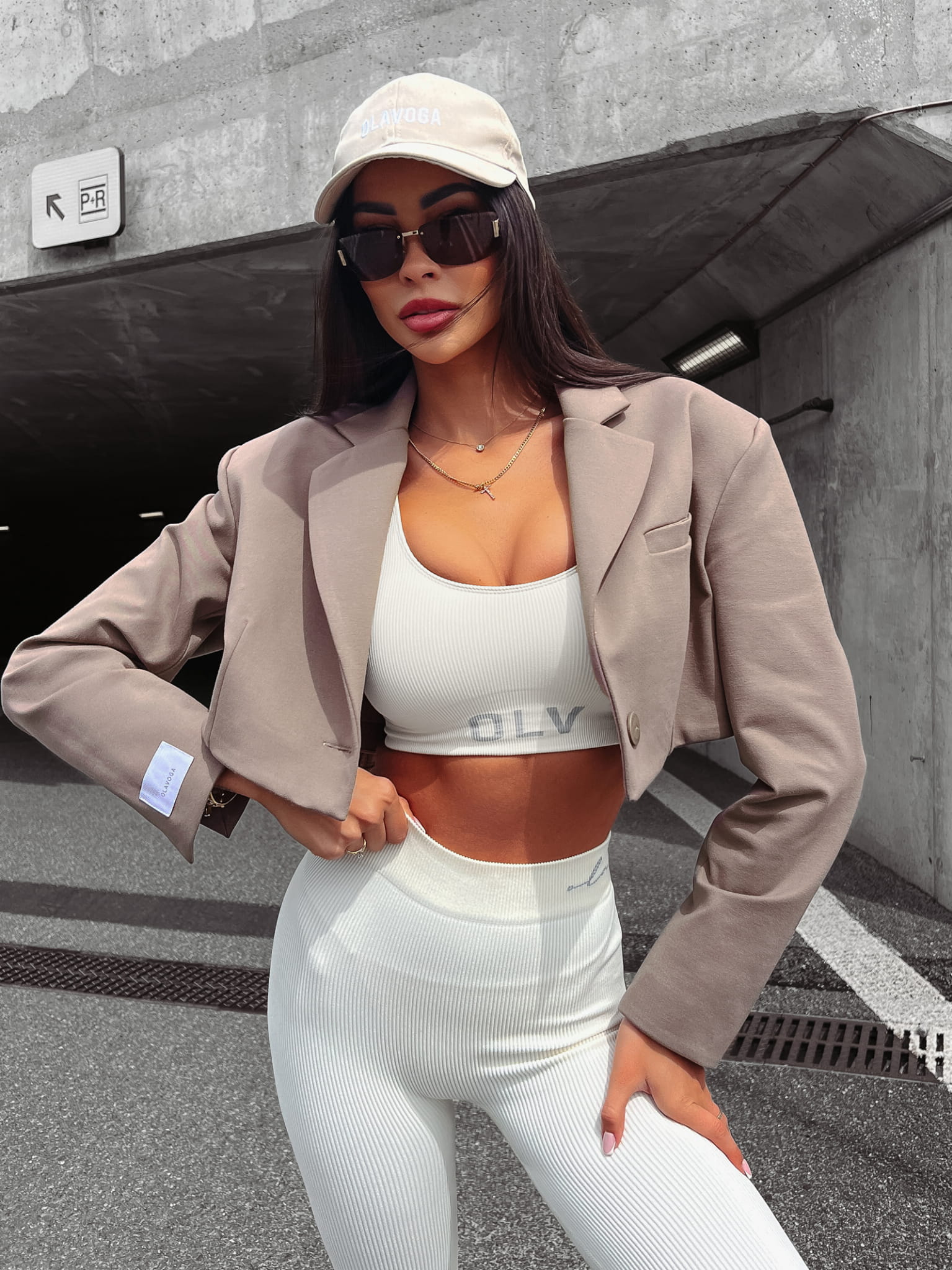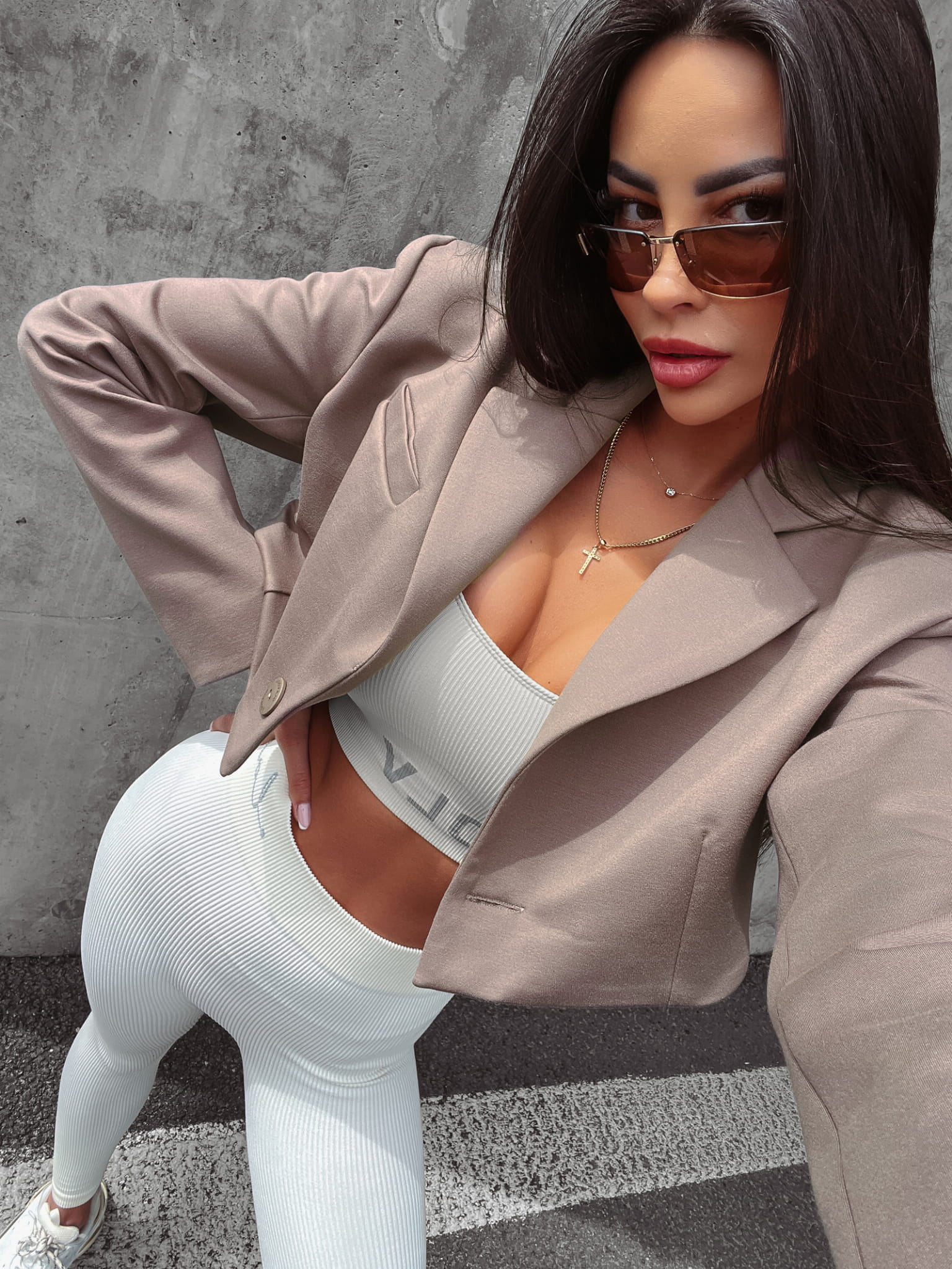 Krótki, gładki żakiet, zapinany na jeden guzik. Kołnierz z klapami, wewnątrz podszewka. Prosty krój. Na rękawie minimalistyczna naszywka.